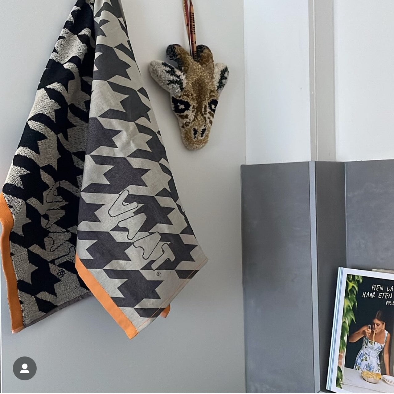 The tea towel measures 50 x 70 cm. The hanging loop is located in the middle of the long side, making them look stylish. Of course, they're machine washable. Designed in Amsterdam, made in Portugal.